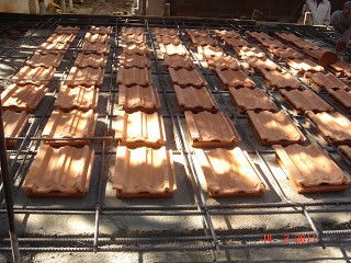 Steel grid work prepared and laid; tiles are placed in pairs with a mud mix between them.